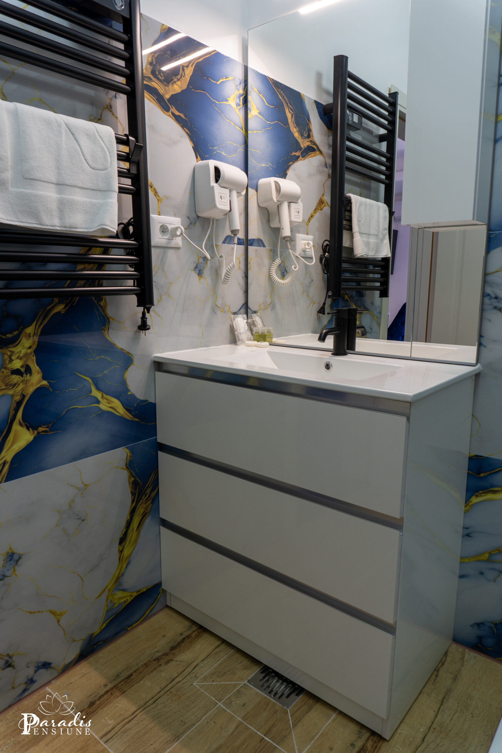 Dotată cu un pat matrimonial generos (200×200 cm), mobilier modern și baie privată cu duș, camera oferă o atmosferă caldă și relaxantă, ideală pentru un sejur odihnitor